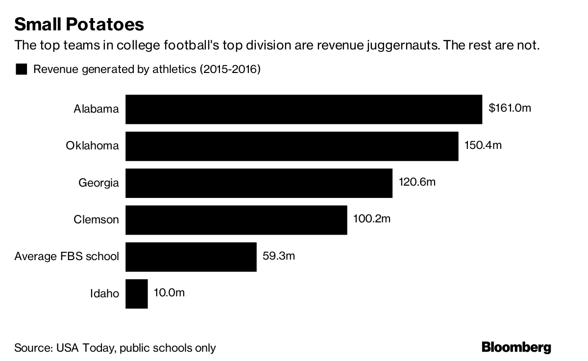 So far, Idaho remains an outlier. The FBS continues to grow, creating a glut of schools at the bottom of the division. Of the 112 public universities in the FBS last year, 45 generated less than $20 million directly from athletics. The average Southeastern Conference school generated $131 million. All but a handful of athletic departments need money from the institution to balance their budgets.