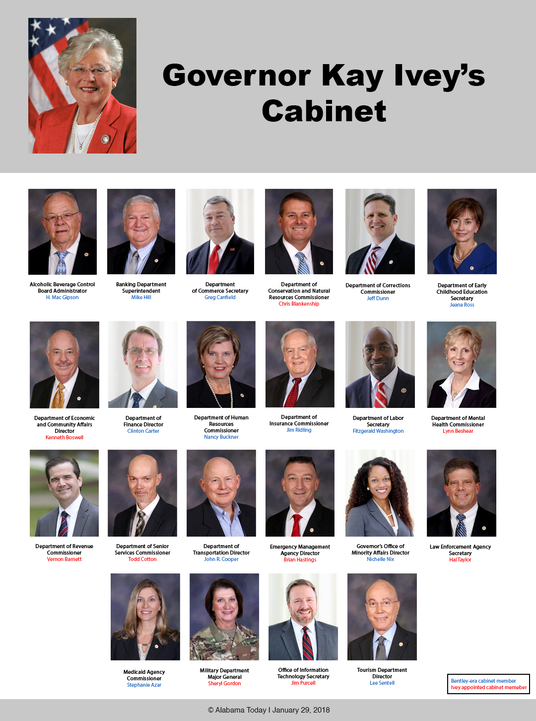 Part of steadying of the Ship of State has meant cleaning house of the Bentley administration as Ivey has dismissed several Cabinet and staff members. Of her 22-member Cabinet, Ivey has currently replaced nine, or 41 percent, of its members.