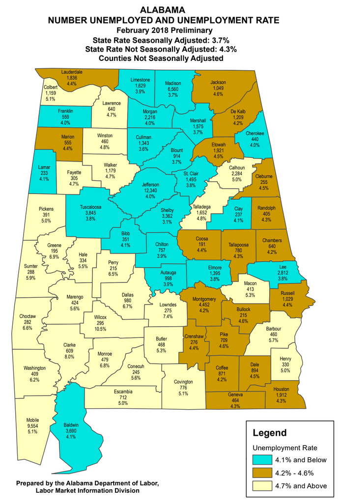 State labor officials said Alabama’s unemployment rate held steady at 3.7 percent in February, unchanged from January’s record low. The month saw strong job gains in education and health care, government and professional and business services.