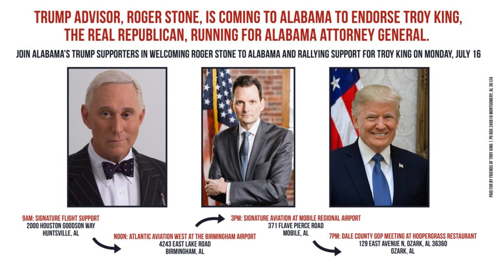 “The choice for who to elect as Alabama’s Republican nominee for Attorney General could not be more clear. Only one candidate stood with President Trump since the beginning of his campaign and that was Troy King. Only one candidate is a true Republican and that is Troy King.” Stone said. “Steve Marshall does not and has never supported President Trump. He is an Obama supporting Democrat who only switched parties to try to get elected. Steve Marshall can’t be trusted.”