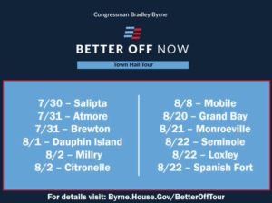 Known as the “Better Off Now” Town Hall Tour, Byrne will hold public town halls in each of the six counties that make up Alabama’s 1st Congressional District. There, he will discuss how he believes the American people are better off now thanks to a booming economy, stronger military, and safer communities.