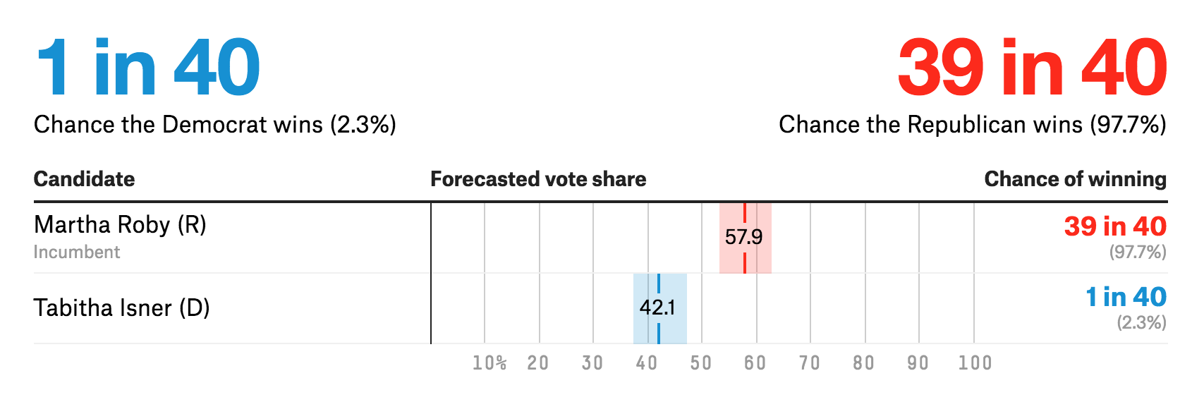 FiveThirtyEight, a statistics-driven news-and-analysis site, anticipates the 2nd District race being in the closest in the state, giving Isner a 1 in 40 chance of winning the seat. That said, Alabama’s 2nd District has only supported a Democrat for Congress once, and only for only two years, since 1965.