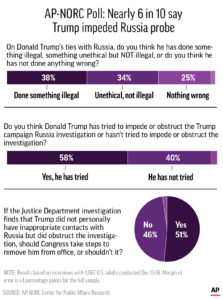 A majority of Americans say they believe President Donald Trump has tried to obstruct the investigation into his campaign’s ties to Russia, though the public is divided on whether he should be removed from office if he’s found to have stymied the probe, according to a new poll by The Associated Press-NORC Center for Public Affairs Research.