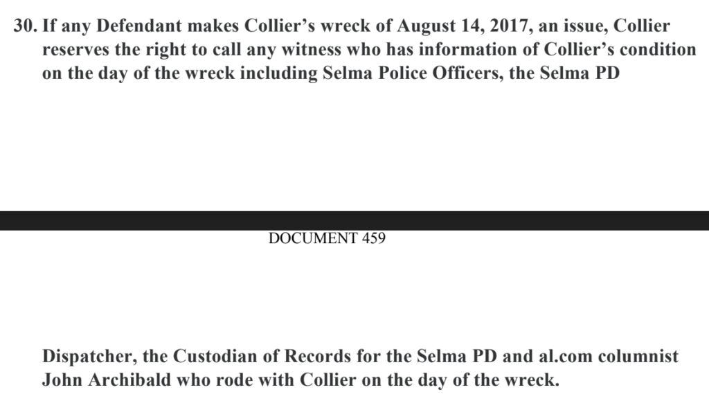 “If any Defendant makes Collier’s wreck of August 14, 2017, an issue, Collier reserves the right to call any witness who has information of Collier’s condition on the day of the wreck including Selma Police Officers, the Selma PD Dispatcher, the Custodian of Records for the Selma PD and al.com columnist John Archibald who rode with Collier on the day of the wreck,” reads the subpoena.