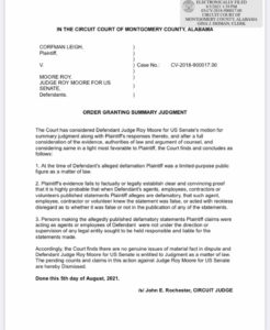 Judge Moore stated, “The court has finally recognized what we knew all along. My campaign for US Senate has in no way defamed plaintiff Leigh Corfman. We look forward to proving in open court, before a jury, her political motivation for making false allegations in my Senate campaign.”