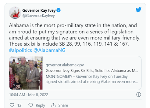 “Alabama is the most pro-military state in the nation, and I am proud to put my signature on a series of legislation aimed at ensuring that we are even more military-friendly,” stated Ivey. “I commend the work by the Military Stability Commission, chaired by Lieutenant Governor Ainsworth, as well as the members of the Alabama Legislature for passing these important bills.”