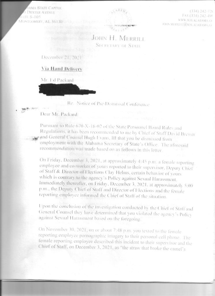 According to the second document, titled “Ed Packard’s Dismissal,” Packard used his announcement of Secretary of State to help cover up credible allegations of sexual harassment that were going to scheduled for the same day. In December 2021, Packard was scheduled for a pre-dismissal hearing for allegations of sharing pornography on a cell phone, along with other allegations. Packard has stated publicly that he resigned from the SOS office on December 28th, 2021 at 5 pm in order to pursue running for Secretary of State. However, he was actually scheduled for a pre-dismissal hearing due to credible allegations of sexual harassment inside the Secretary of State’s office at 1 pm that same day.