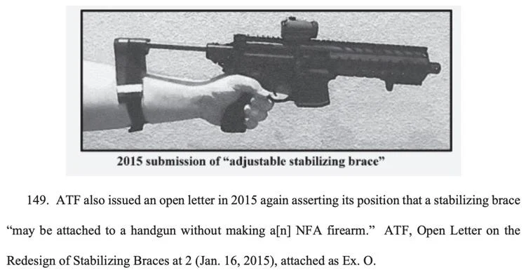 The complaint for declaratory and injunctive relief was filed in the U.S. District Court in North Dakota. The document includes information from a patent for a “Pistol Stabilizing Brace,” used to secure a pistol to a shooter’s forearm to stabilize firing. “Through this design, braces are orthotic devices that allow users to more safely and accurately fire handguns,” the document states. Braces are often used by older people and those with limited mobility and prevent recoil and help with accuracy.
