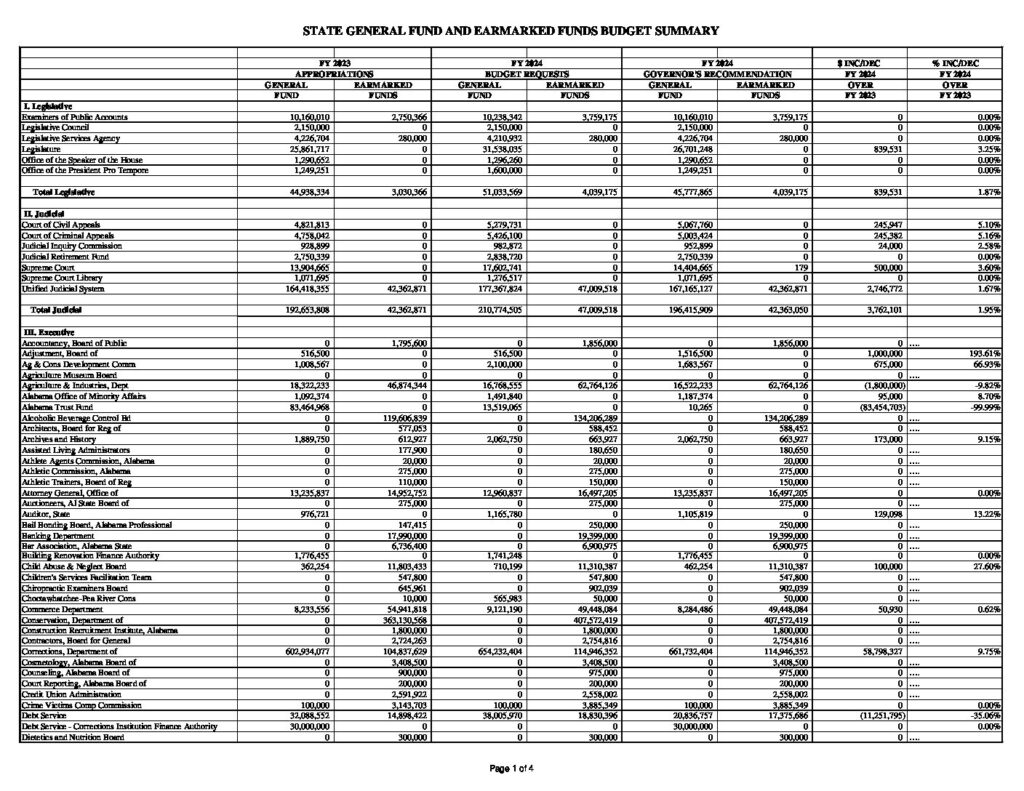Alabama Gov. Kay Ivey’s $18.56 billion budget proposal for fiscal 2024 is only $25.6 million less than the total requested by state agencies.