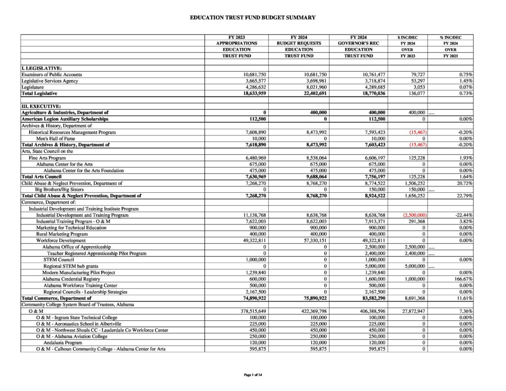 Ivey also wants increases in the state’s education spending, with $349.9 million in additional K-12 outlays (6.22% increase over 2023) and $135.9 million for higher education, growth of 6.42%.