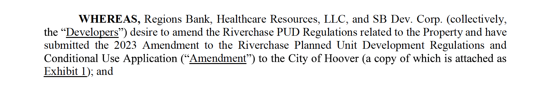 The City of Hoover passed Ordinance 23-2634, “2023 Amendment to the Riverchase Planned Unit Development Regulations and Conditional Use Application,” dated August 14, 2023. The document is 419 pages long.